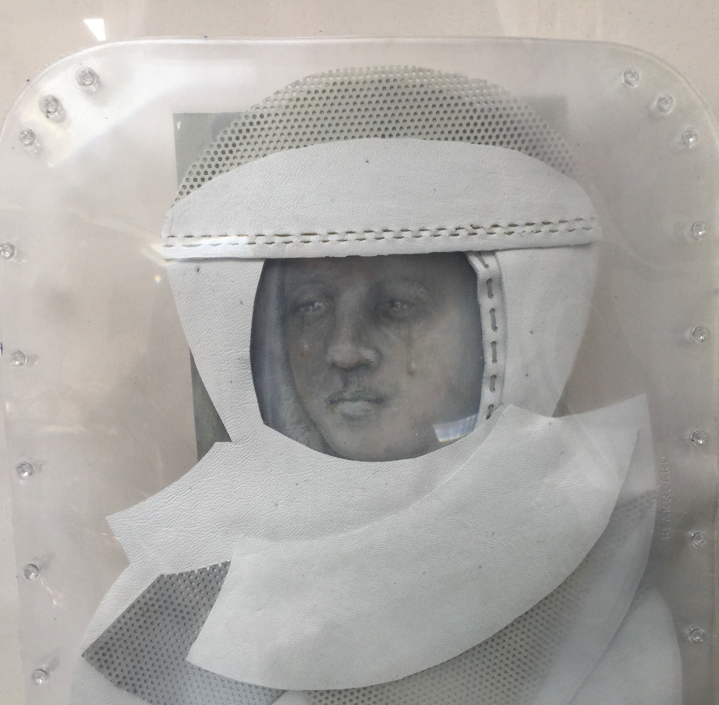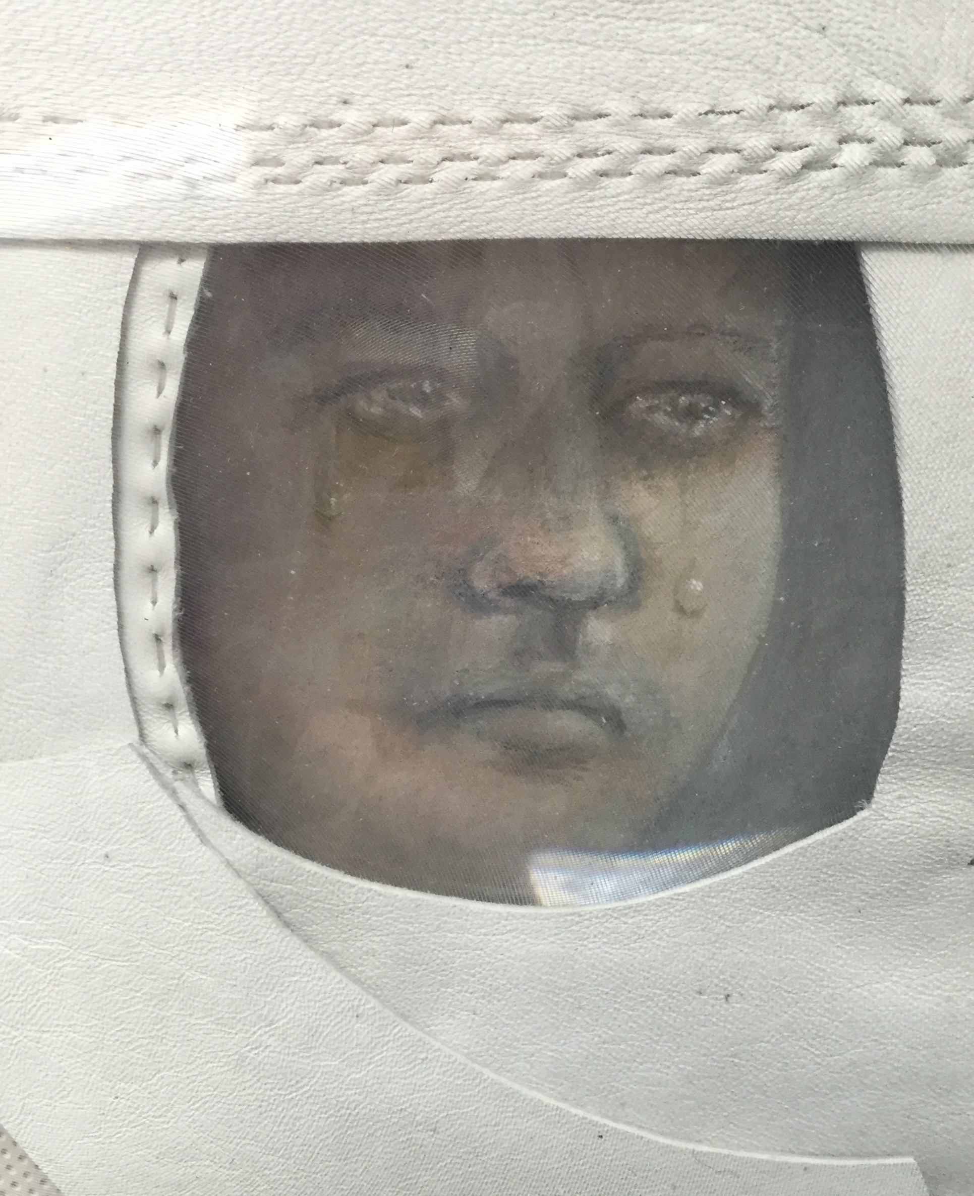 Crying Astronaut 2018 ( 40×60 oil on paper, plexiglas, metal, leather, lenses)